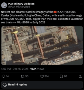 Kitajska je začela graditi svojo četrto in največjo letalonosilko doslej, kar potrjujejo novi satelitski posnetki. Ladjedelnica Dalian je prizorišče nastajanja te vojaške pošasti, ki naj bi bila končana do leta 2028 ali 2029. Poimenovana Tip 004 bo strateško orodje za uresničevanje pomorskih ciljev Pekinga. Japonski možganski trust Japan Institute for National Fundamentals (JINF) je analiziral te satelitske posnetke in potrdil, da Kitajska gradi letalonosilko z jedrskim pogonom, kar pomeni tehnološki preskok za kitajsko mornarico.