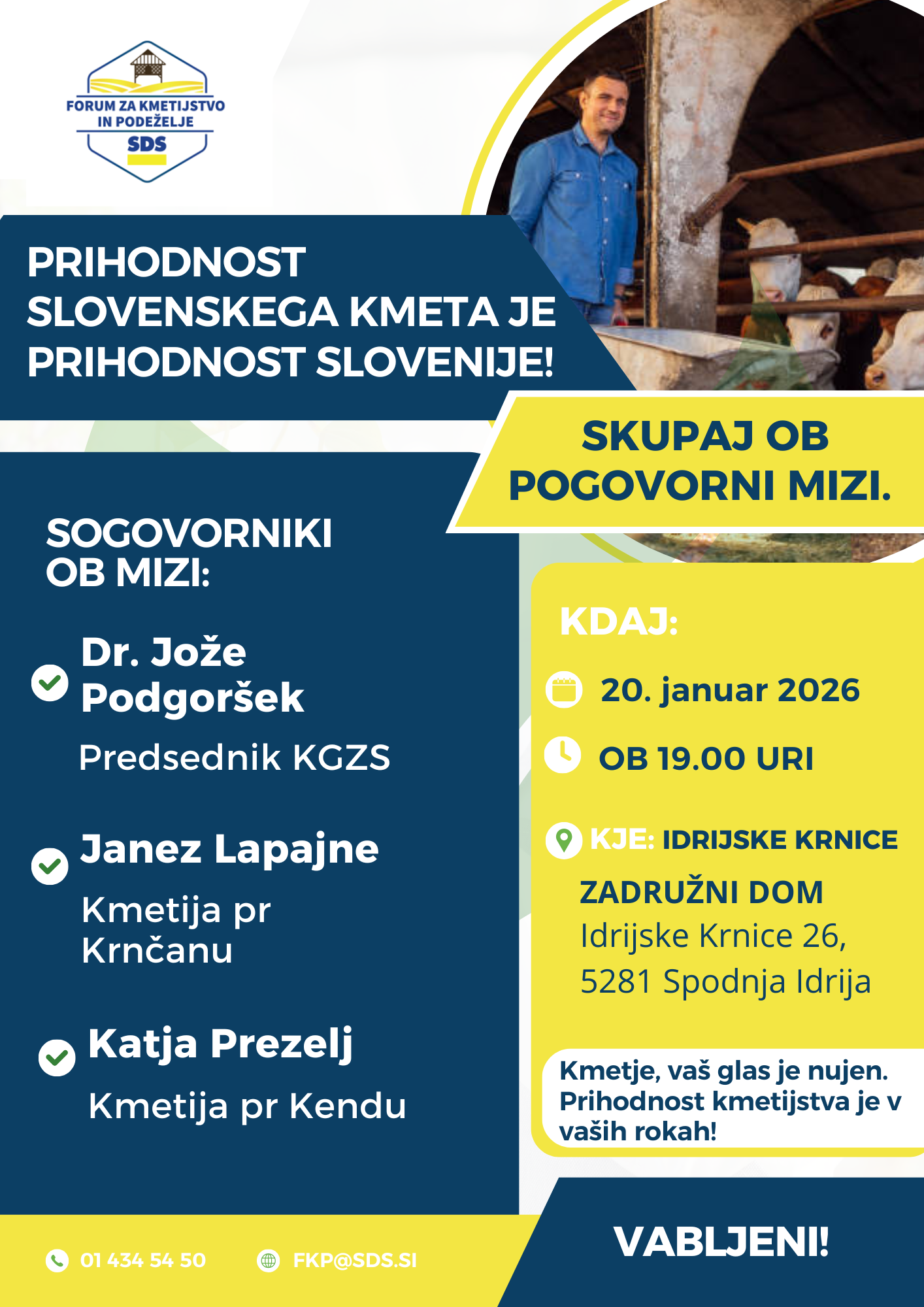 V Idrijskih Krnicah bo potekalo srečanje, posvečeno prihodnosti slovenskega kmetijstva. V torek, 20. januarja 2026, ob 19. uri bo v Zadružnem domu Idrijske Krnice okrogla miza z naslovom »Prihodnost slovenskega kmeta je prihodnost Slovenije«, ki jo organizira Forum za kmetijstvo in podeželje SDS.