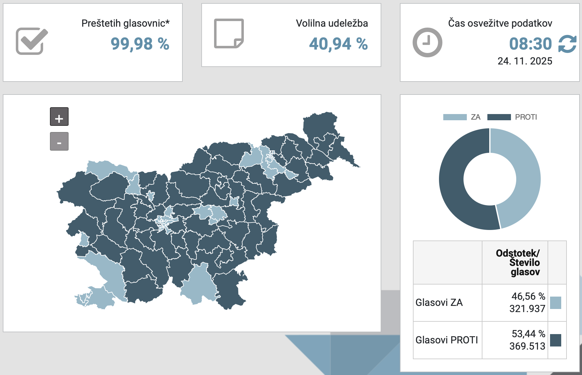 Volilna udeležba je dosegla 40,93 odstotka, vendar bo ta številka še naraščala, ko bodo prišteli glasovnice, prispele po pošti iz Slovenije in tujine. To bo vplivalo na končno število glasov, a trenutne napovedi kažejo na jasno zavrnitev zakona.
